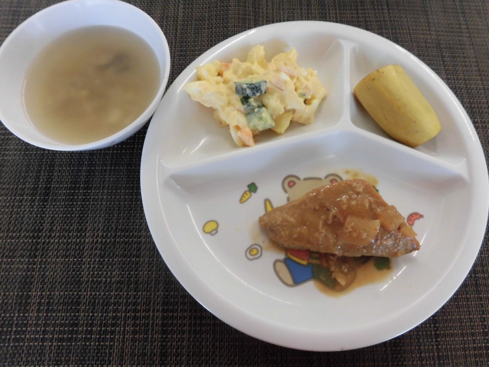 さばのみそ煮、サイコロサラダ、中華スープ(もやし・しめじ)、果物