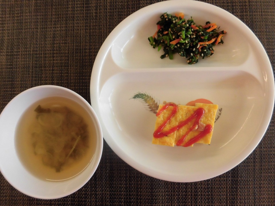 トマトオムレツ、ほうれん草のごま和え、みそ汁(葱・わかめ)