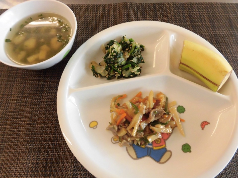 チンジャオロース、ごま和え(キャベツ・ほうれん草)、みそ汁(小葱・油揚げ)、果物