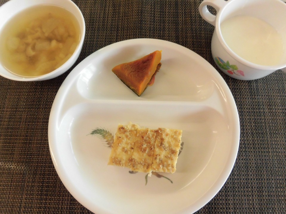 松風焼き、かぼちゃの甘煮、みそ汁(大根・しめじ)、ヨーグルト