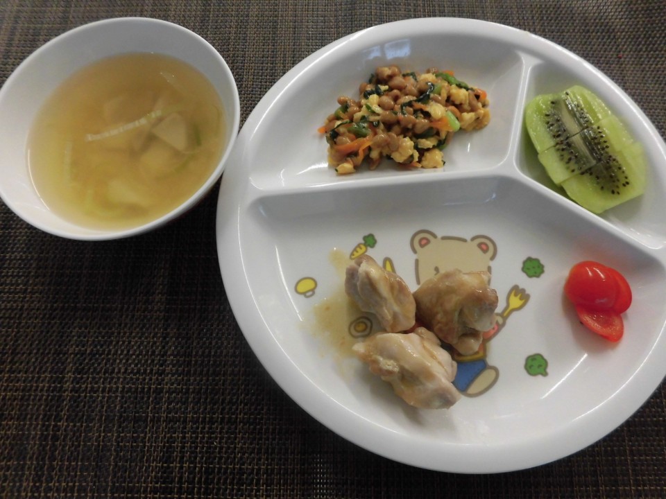 チキンソテー、付け合わせ(ミニトマト)、炒り卵入り納豆、みそ汁(里芋・葱)果物