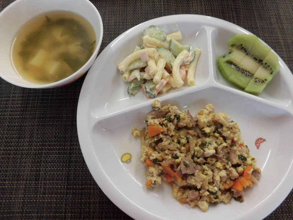 豆腐チャンプルー、マカロニサラダ、みそ汁(ワカメ・ポテト)、果物