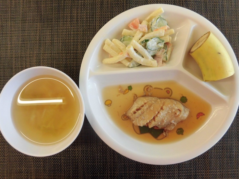 煮魚(赤魚)、マカロニサラダ、みそ汁(さつま芋・葱)、果物