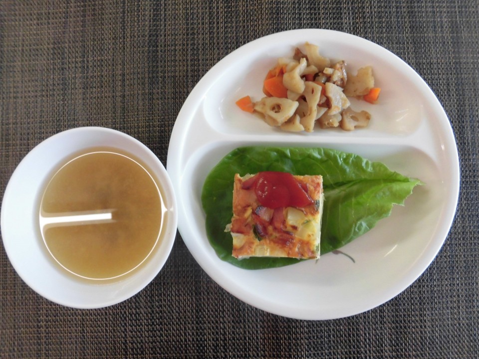 スパニッシュオムレツ、付け合わせ(サラダ菜)、れんこんの土佐煮、みそ汁(もやし・なめこ)