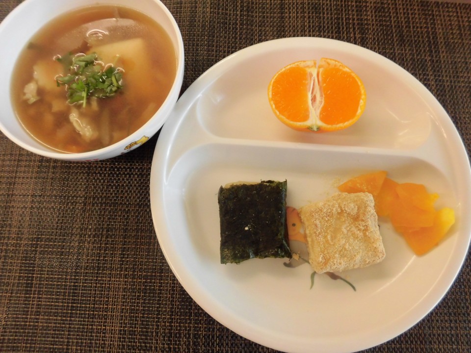 お雑煮、磯部餅、きな粉餅、たくあん、果物