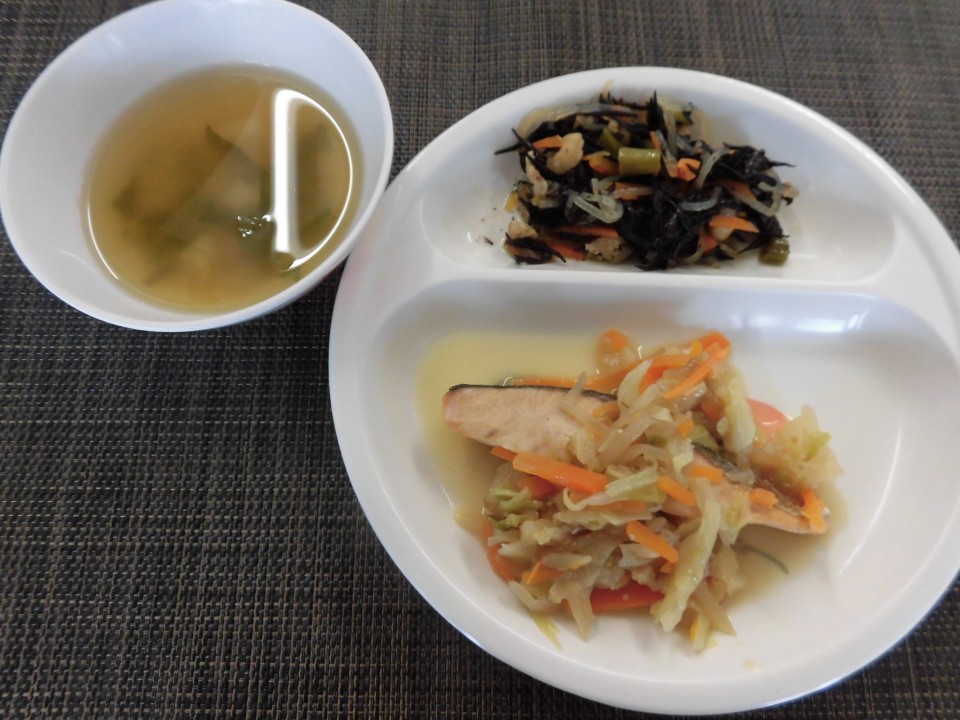 鮭のちゃんちゃん焼き、ひじき炒め、みそ汁(蕪(葉)、油揚げ)