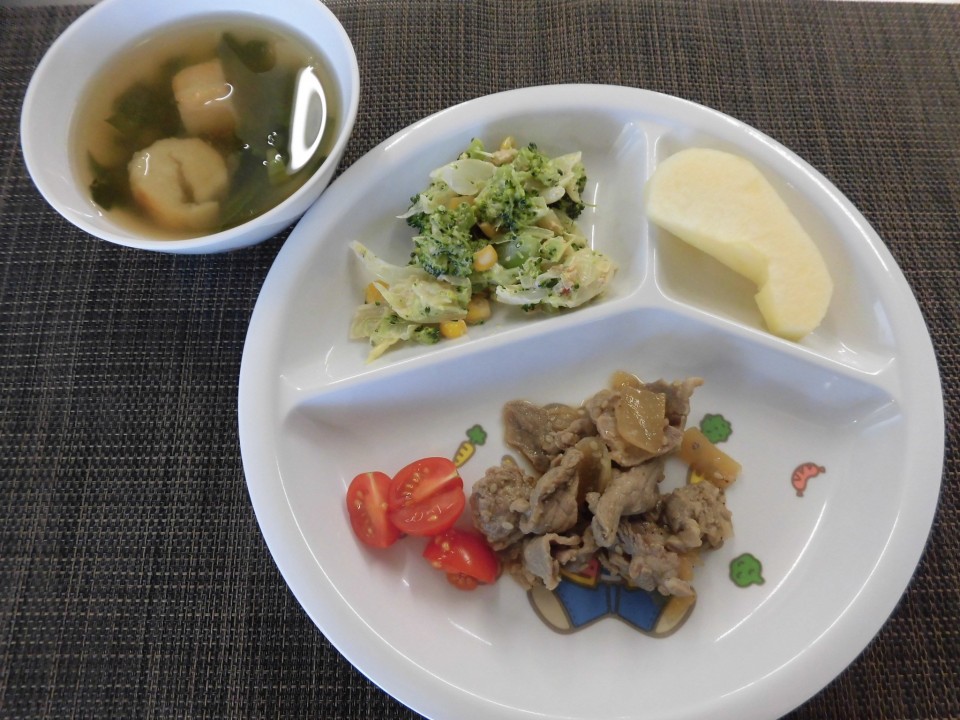 焼き肉、付け合わせ(ミニトマト)、野菜のおかかマヨ和え、みそ汁(小松菜・麩)、果物