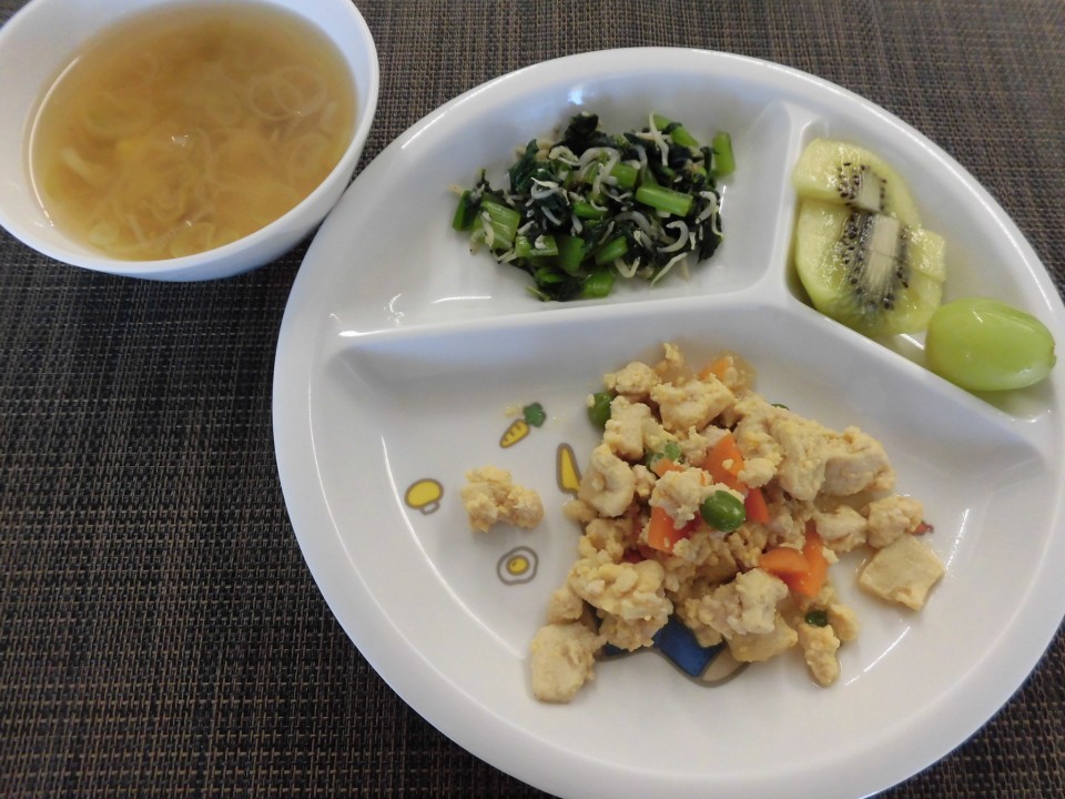 炒り豆腐、しらす和え(ほうれん草)、みそ汁(さつま芋・葱)、果物