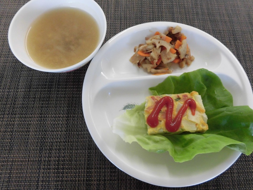 スパニッシュオムレツ、付け合わせ(サラダ菜)、れんこんの土佐煮、みそ汁(もやし・なめこ)